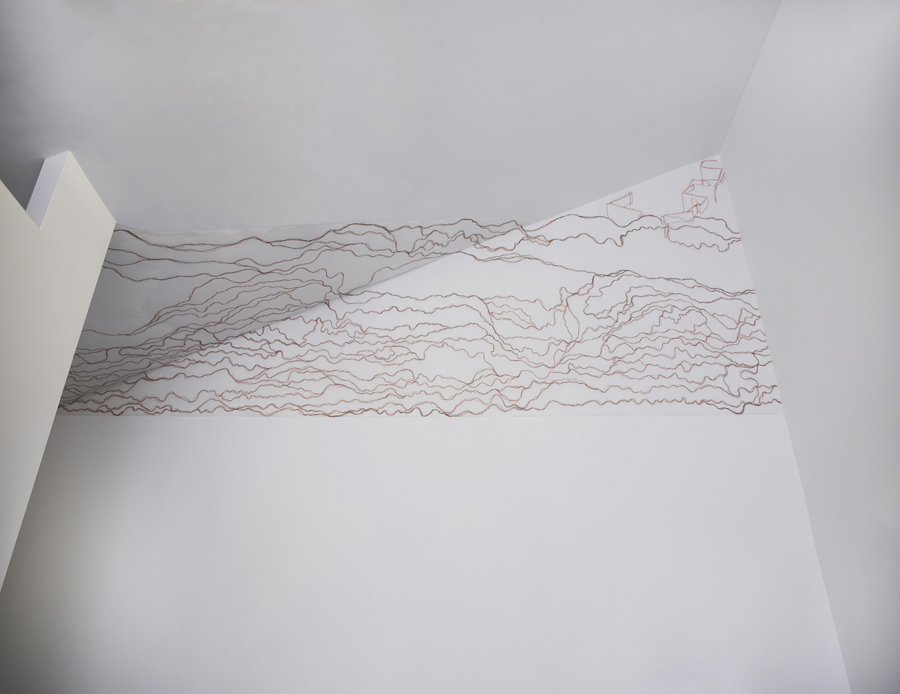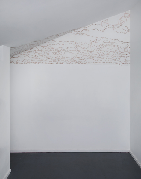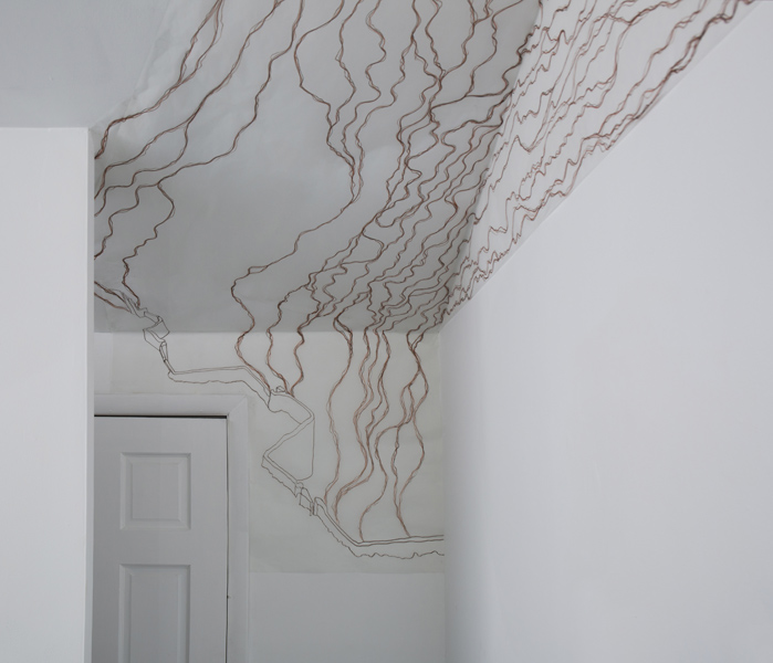 This site-specific drawing installation was located at the top of one wall and on the ceiling of the gallery at Trestle Projects,