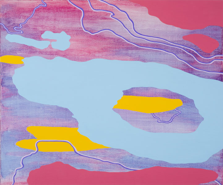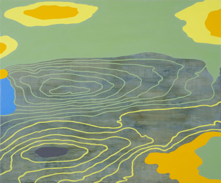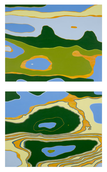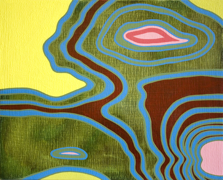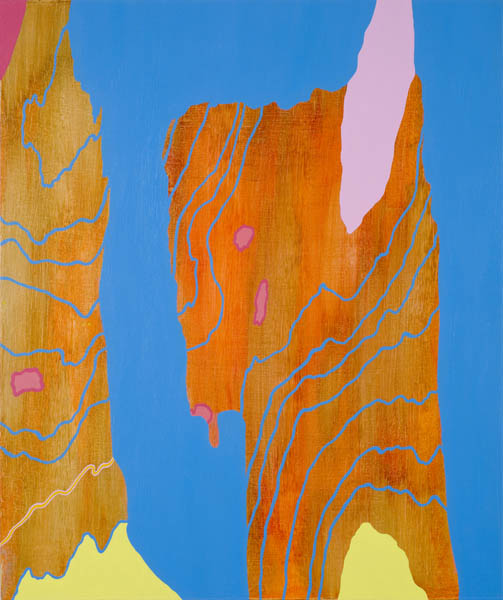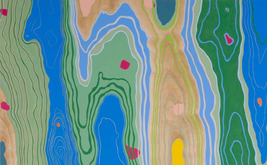 In this series, each gouache-and-acrylic painting is based on the wood-grain pattern of the panel that it is painted on.